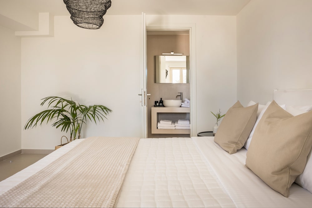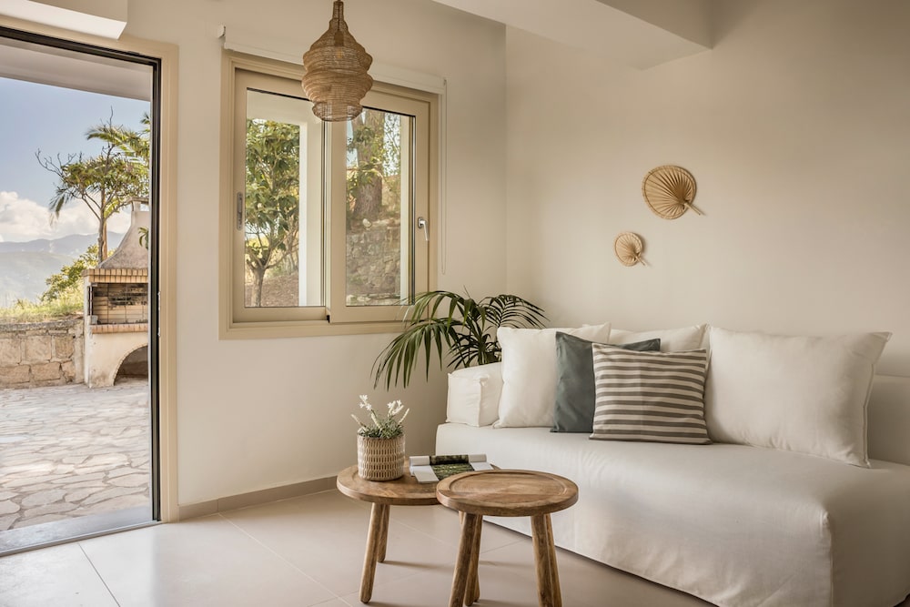 360º Residences are located on a hill in Xaravontas, with a magnificent view of the Ionian Sea. The five houses - for 4 people - all have an unobstructed view of the sea. Each of the houses has an open-plan living with a fully equipped kitchen, two (ensuite) bedrooms, and access to a veranda or balcony with panoramic views. All guests have access to the lush Mediterranean garden and the shared swimming pool.
