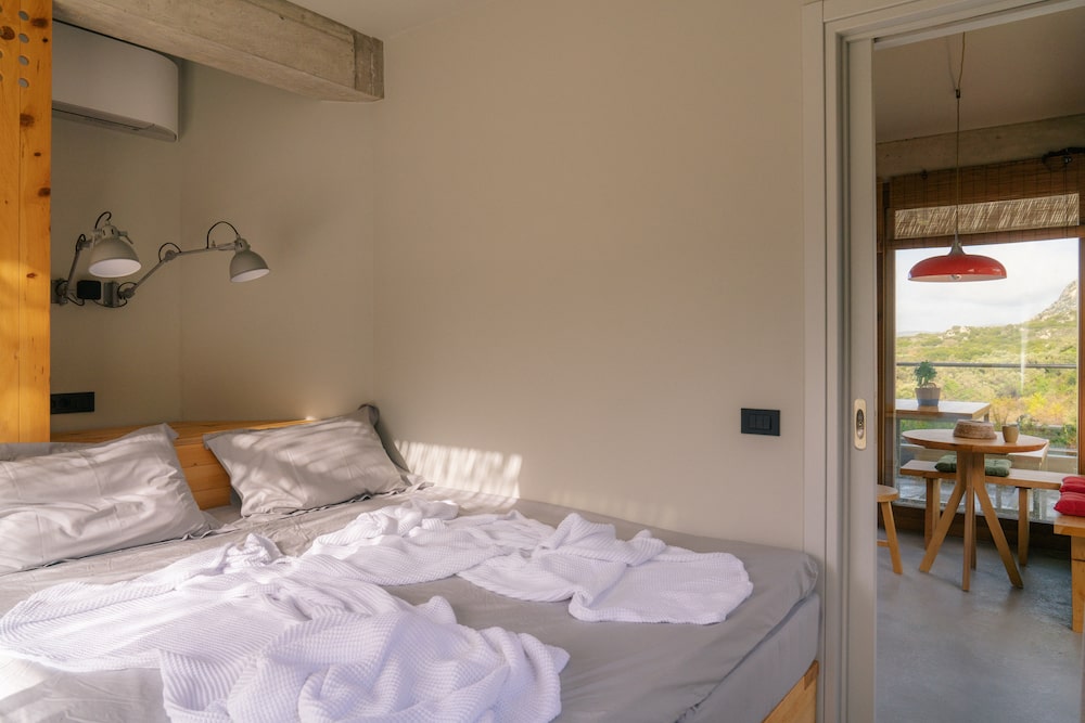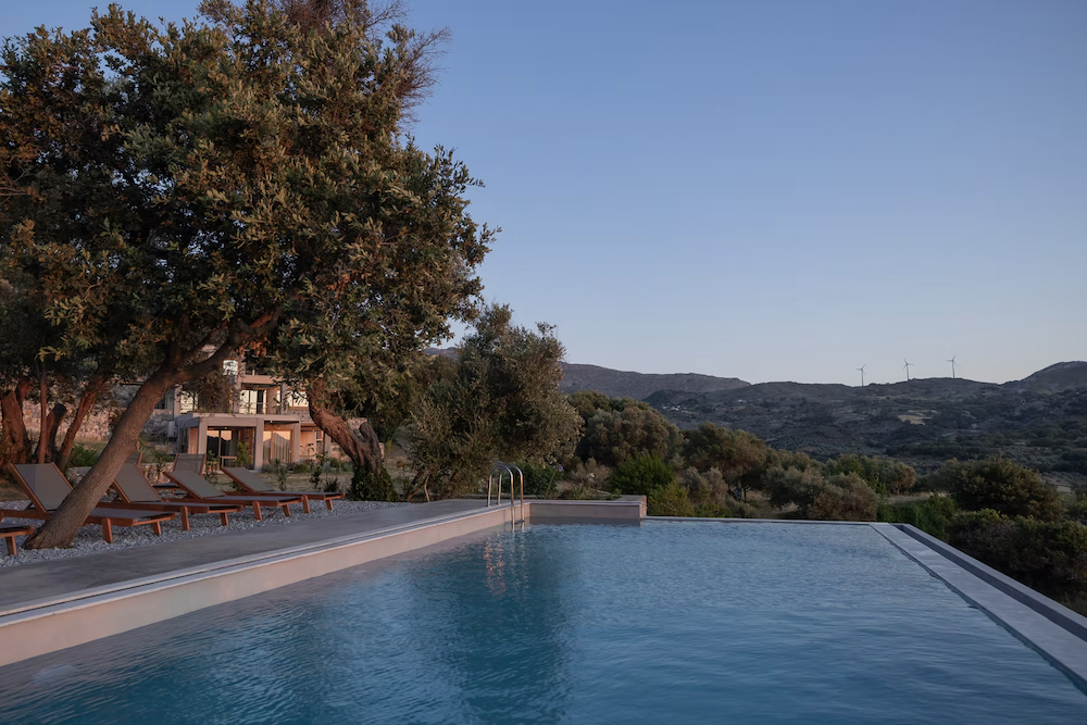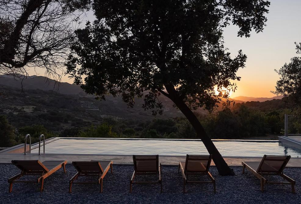 The buildings radiate understated elegance: concrete and local stone form the foundation, combined with light wood and bespoke furniture designed by Larsen himself. Interiors are simple yet comfortable, with Cocomat beds, compact kitchens, and terraces overlooking valleys and mountains. Everything feels natural, cool, and harmonious - as if the houses are part of the landscape. Outside, a 6,500 m² garden unfolds with centuries-old olive and fruit trees, terraces, shaded corners, and a shared infinity pool. Here you can relax, take in the views, or pick fresh vegetables and herbs from the garden.