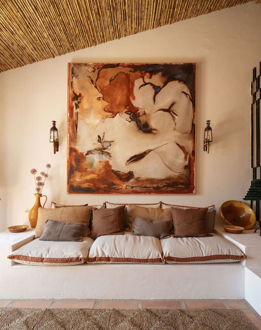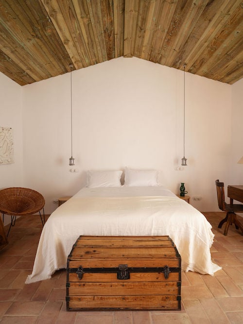 Montinhos was carefully renovated by the Portuguese architect Pedro Ressano Garcia, who respected the original character of the old farmhouse while creating a calm, contemporary ambiance. Inside, a warm rural style prevails with many natural materials. Lime-washed walls, rustic Alentejo tiles, wooden beams, and natural stone give the interiors an authentic feel. Many materials from the original ruins — such as roof tiles, stones, and beams — were reused. A subtle art collection with works by Portuguese artists adds a personal touch throughout the spaces.