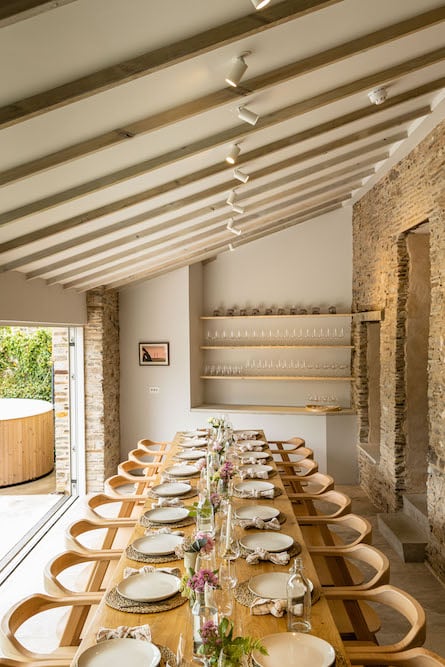 - The spacious dining room features a wooden dining table for 26 people and a glass wall that can be fully opened and leads to the garden