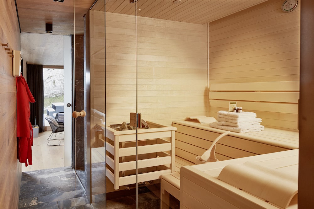 - In the bathroom you will find personal care products made from 100% organic ingredients, as well as sauna towels.