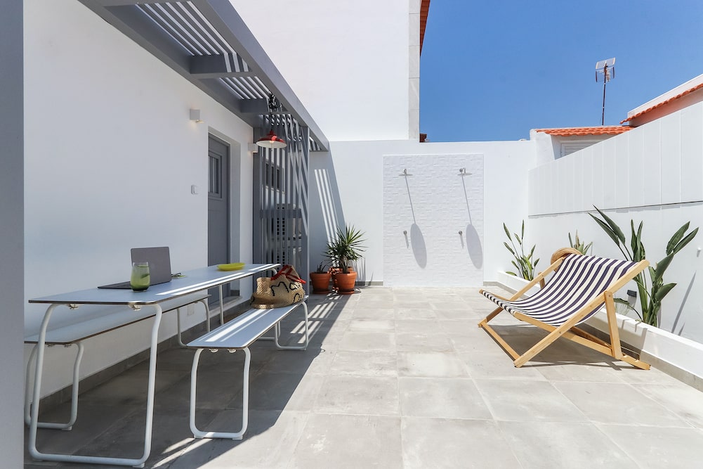 - A patio at the front of the house with two outdoor showers. Here is an extra dining table that is oriented to the east, perfect for starting the day with breakfast in the sun!