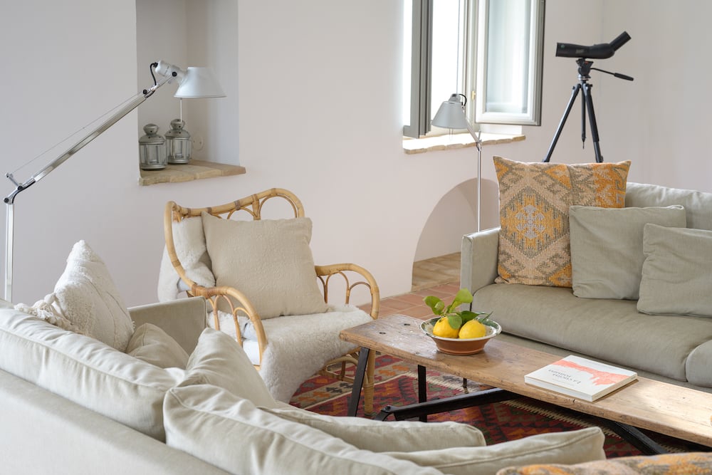 - Open living room with double ceiling height, with 2 comfortable sofas, lounge chairs and a fireplace.
