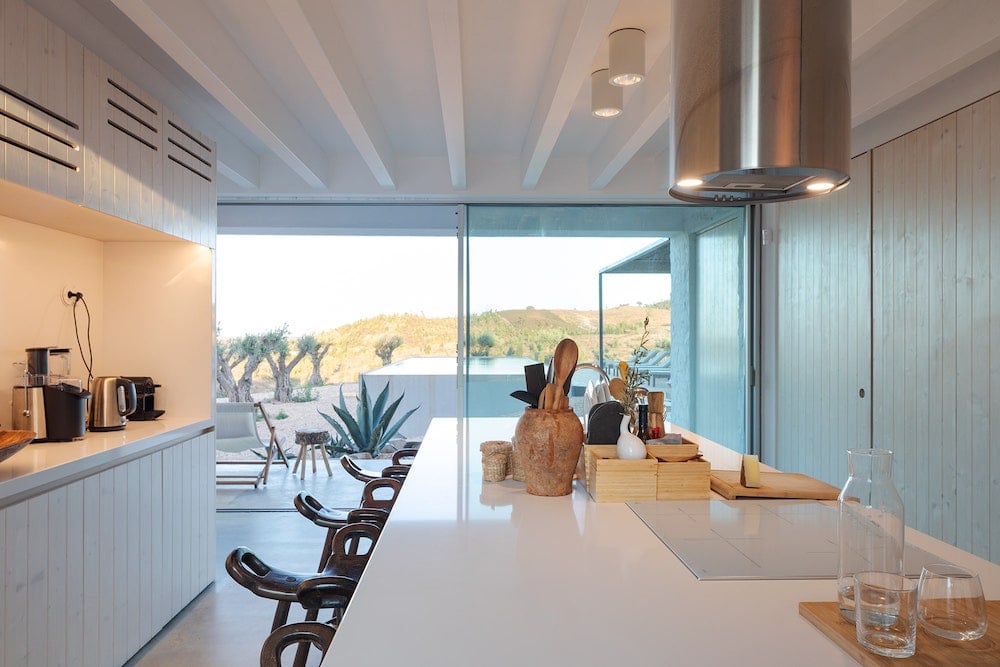 - the large open living room has a fully equipped kitchen; large refrigerator, freezer, two ovens, dishwasher, cupboards full of crockery and glassware, juice centrifuge, blender, Nespresso, cooking island with bar stools, and a toaster