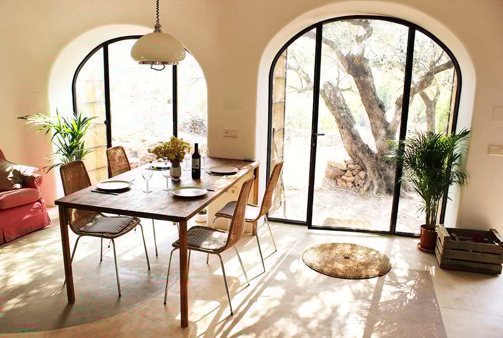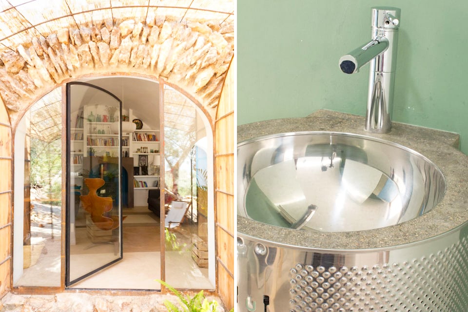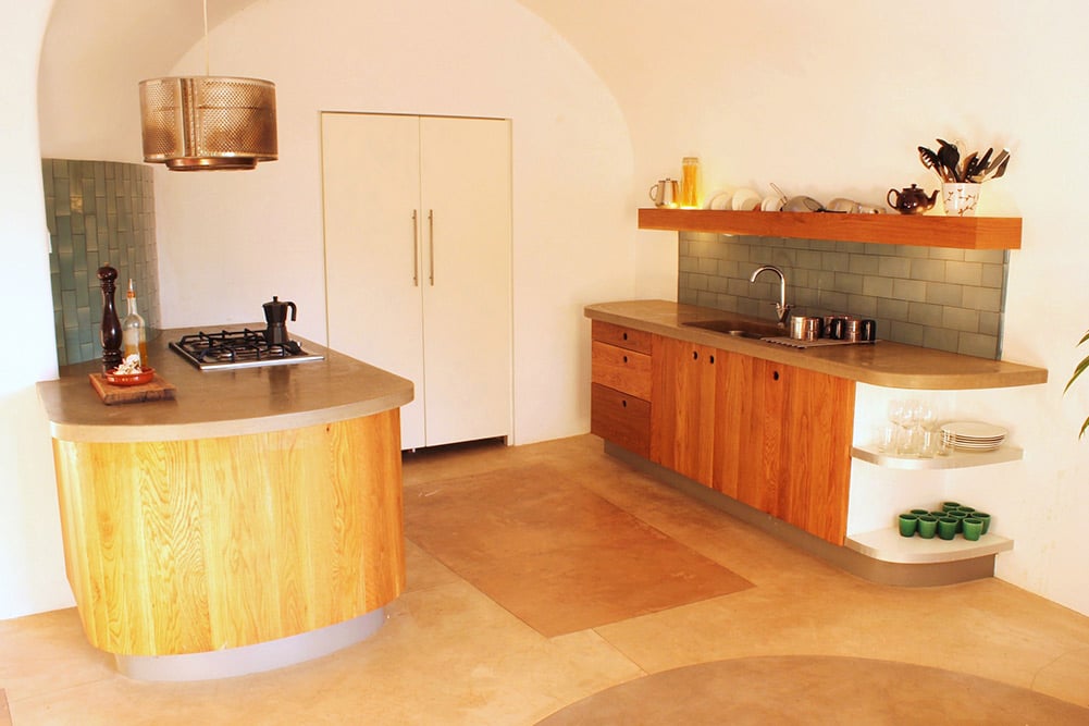 The Serres Carbo el Boix National Park is located around one hour's drive south of Barcelona, past fields of peach and orange trees and charming medieval villages. Casa de les Arques is accessed via a 4 km long dirt road lined with almond and olive groves. Hidden and partially covered by earth and grass, this distinctive holiday home in Catalonia blends perfectly into its natural surroundings. An eco friendly property, it was constructed with the environment firmly in mind; the electricity is solar powered, the underground accommodation, which stays cool in the summer and warm in winter, makes air conditioning unnecessary, and a bath and dishwasher have purposely been omitted in order to save water. Yet, with its generous, light-filled space, stylish decor and lovely furniture, Casa de les Arques is an exceptionally comfortable holiday home nevertheless.