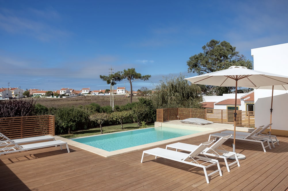- Saltwater swimming pool (7x4m and 140 cm deep) with a wooden sun terrace equipped with sunbeds, parasols, and bean bags