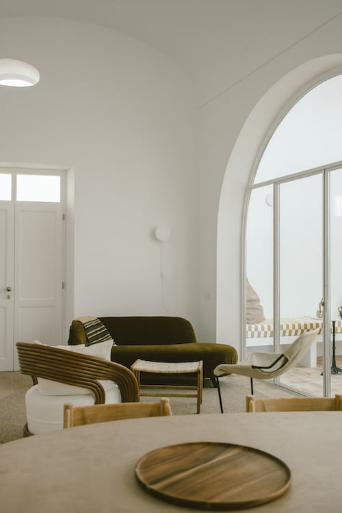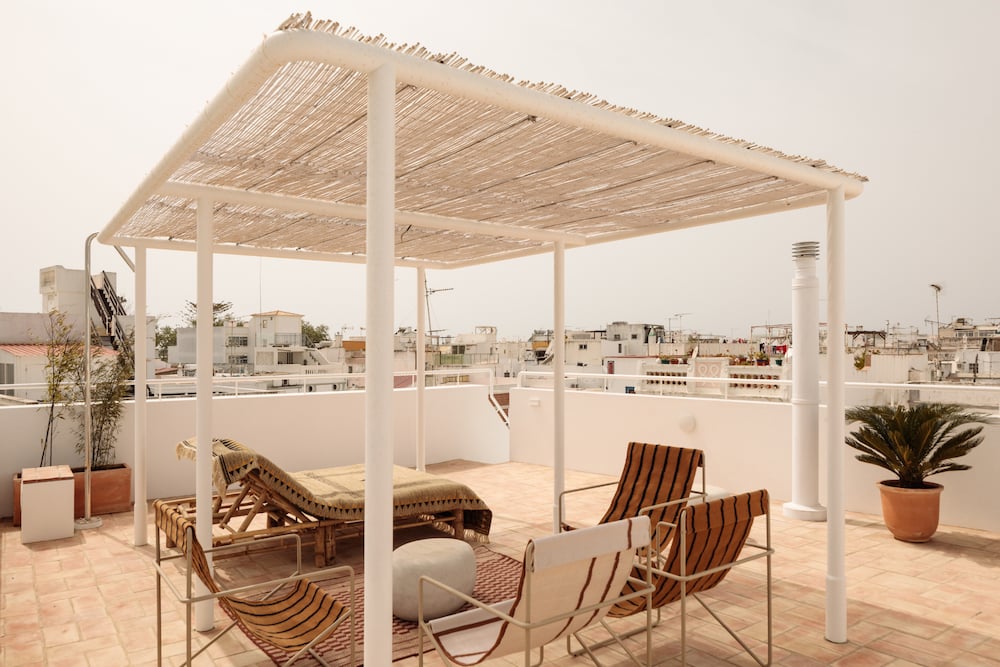 The spiral staircase leads to the perfect blue sky and reveals an enclosed roof terrace with furniture and outdoor shower, minibar and extensive views of the city and Ria Formosa.