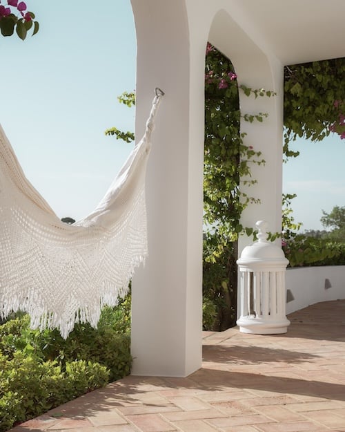 - The sliding doors in the living room and the bedrooms open onto the covered terrace, with several seating areas and a hammock.