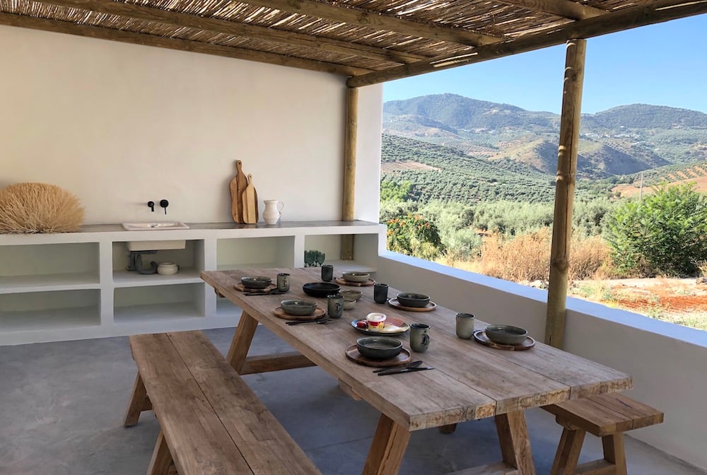 - To the side, another covered terrace with large picnic table and masonry sink and space for the plancha