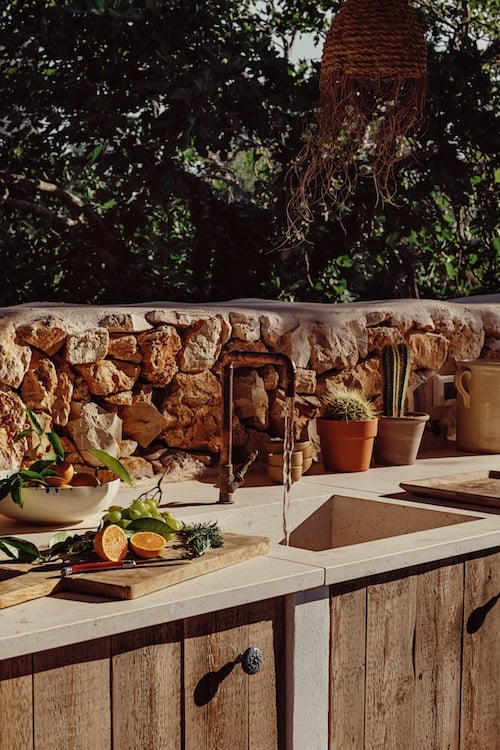 - Outdoor kitchen with a dining table, bar overlooking the pool and essentials like sink, fridge & BBQ.