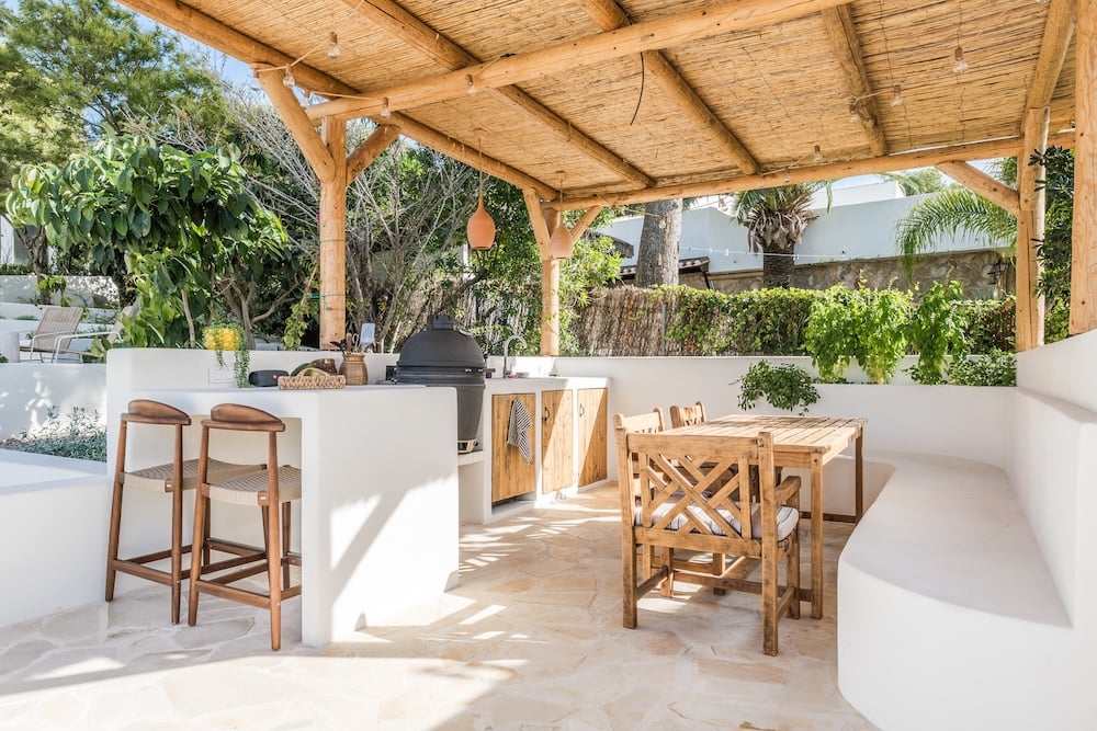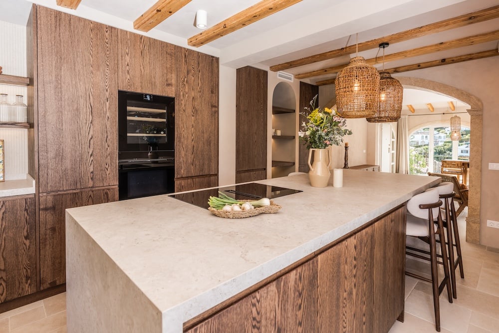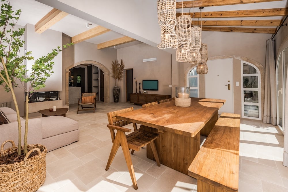 The renovation of the villa was carried out with great care, carefully preserving its authentic Spanish charm. Inside, natural materials, soft sand, earth tones and high-quality finishes dominate. The open-plan living space on the first floor forms the heart of the house: a stylish kitchen with a cooking island and bar, a spacious dining table in the open ‘naya’, and a comfortable seating area around the gas fireplace - a place where you gather all year round. Casa Jin has five comfortable bedrooms and four modern bathrooms with rain showers.