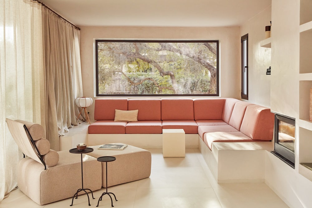 - Open-plan living with a sitting area with built-in sofas by the fireplace and an open kitchen