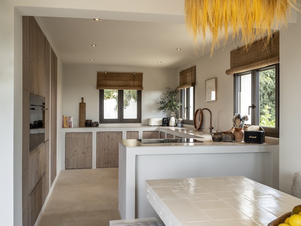 - Adjacent is the dining area with a table for 10 persons and the fully equipped kitchen with essentials like fridge, induction stove, dishwasher & stove. You can admire the stunning views of the sparkling sea from here and also access the veranda.