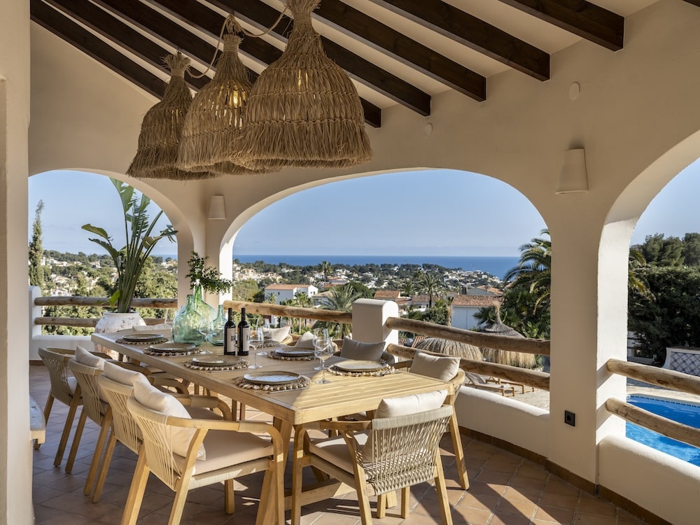- From the veranda, an outdoor staircase takes you to the rooftop terrace with a Spanish masonry bench and cushions for everyone to admire the stunning 360o view of the sunset.