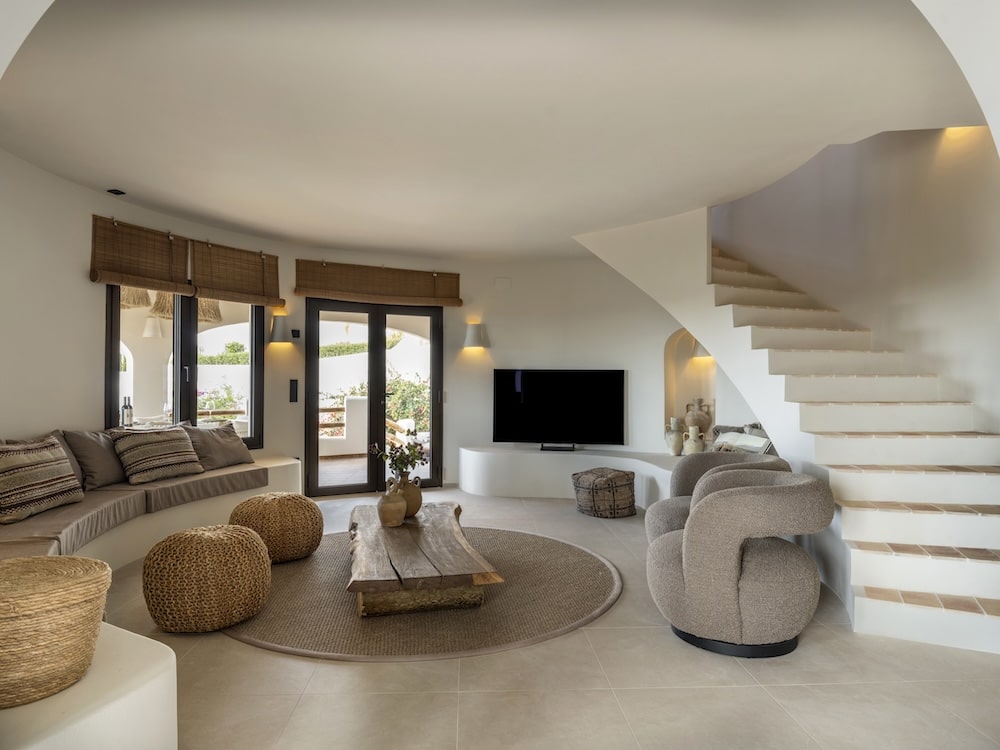 - On this level there is a spacious round-shaped living room with a Spanish masonry bank with cushions, luxury fauteuils and several poufs. From here you can access the panoramic veranda with a large dining table for 12 persons.