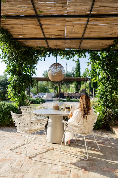 - A pergola with a dining table for 10, a barbecue, and lounge chairs