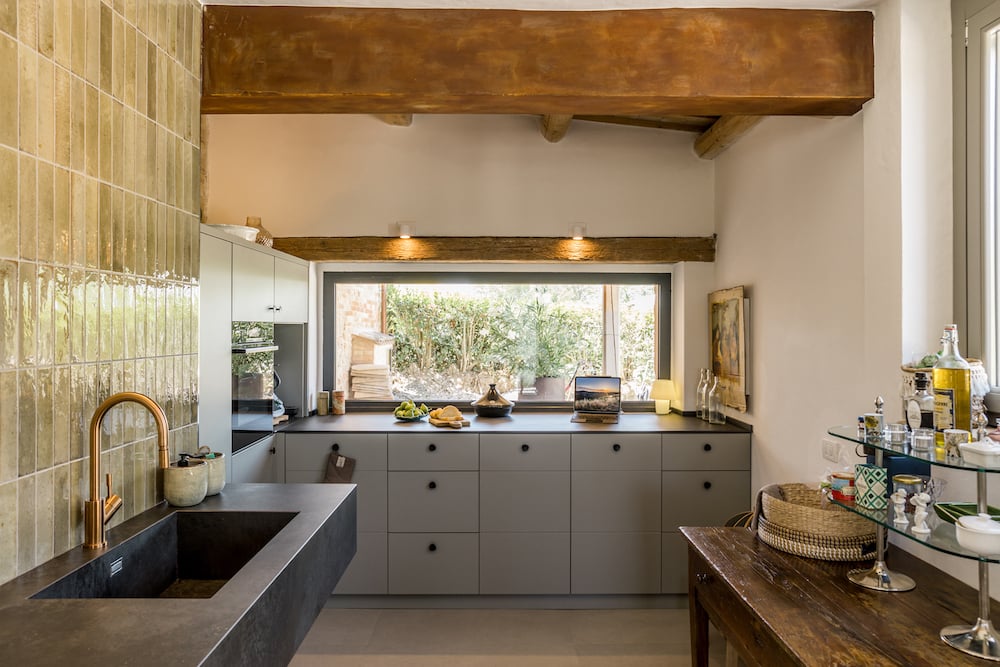 - A spacious kitchen with all modern appliances including a fridge-freezer, dishwasher, oven, gas hob, espresso machine, toaster, and kettle. Furthermore, there is a large sideboard, bench, gas stove, a long dining table, and French doors to the outside.