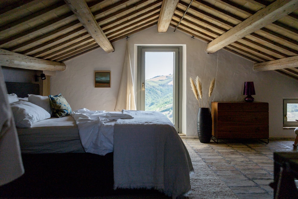 - Four spacious bedrooms, all with a double bed (140/160x200cm) and a private bathroom with a shower, toilet, and sink. An upstairs bedroom adjoins a spacious living room with a fireplace, butterfly chairs, and a sofa.