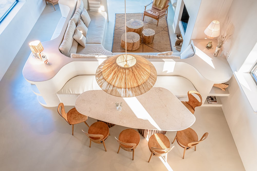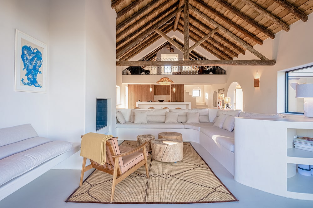 - The open living room has a built-in lounge corner, fireplace, and an open kitchen with a dining table and sofa. The living has large sliding doors that open onto the terrace