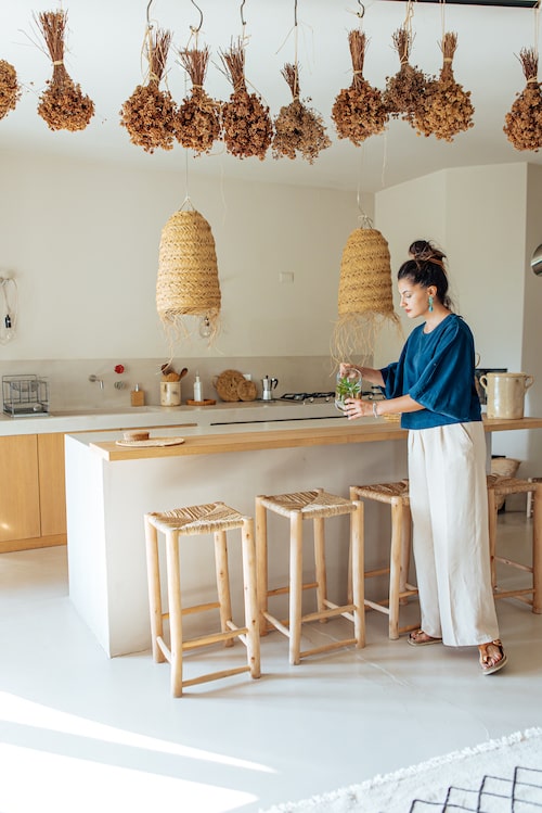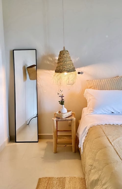 - You enter Casa Tuja on the ground floor, where you will find the kitchen and the living/dining room equipped with a built-in sofa with comfortable cushions. Some wicker stools and various accessories, such as candles and lamps, bring atmosphere to this room.