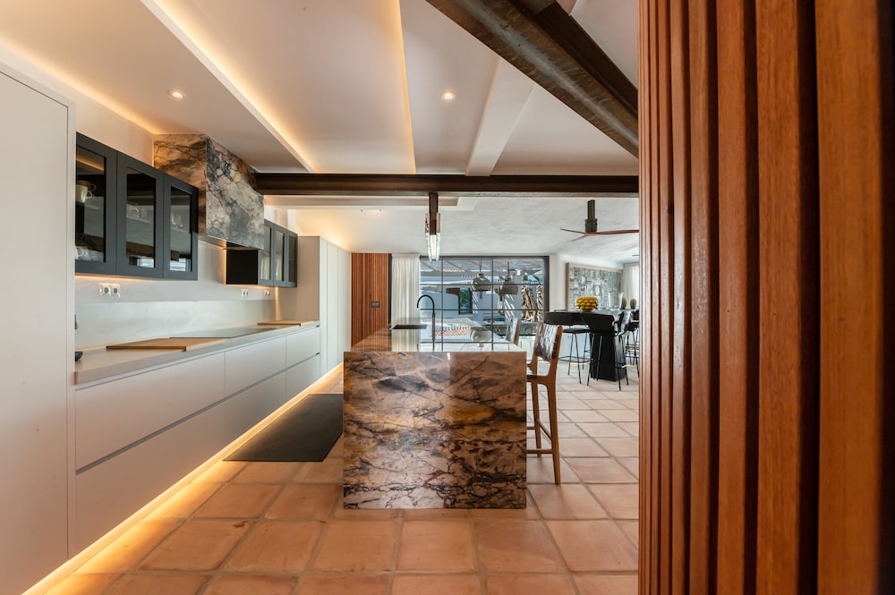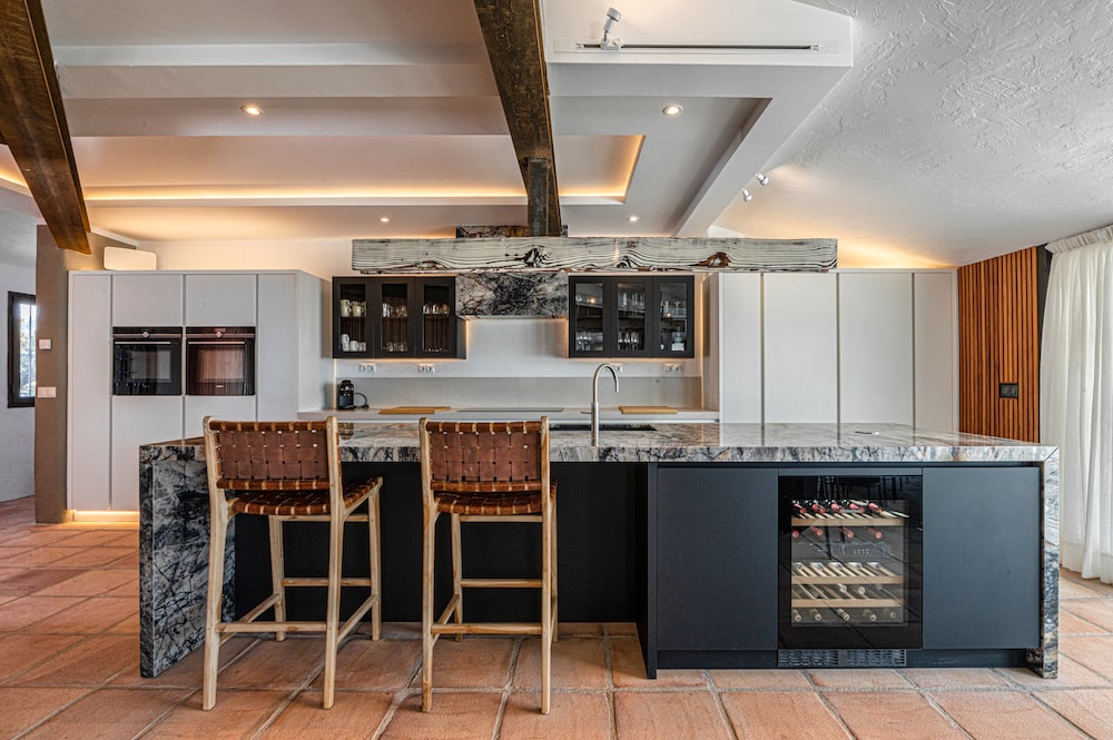 - The sleek kitchen is equipped with a large marble cooking island annex breakfast bar and all modern appliances including an oven, induction hob, dishwasher, fridge/freezer, wine climate cabinet, Nespresso machine, and all crockery and cooking utensils. Here you have all the facilities to prepare a delicious meal ... but you probably can't get enough of the wood oven pizza and BBQ evenings.
