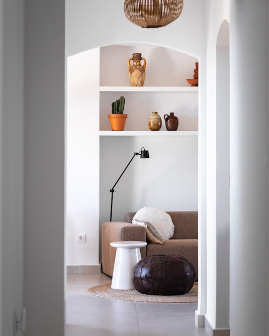 - Stylish living room with a comfortable sofa, dining table, and passage to an office area with a desk and a sofa bed where a child can sleep.