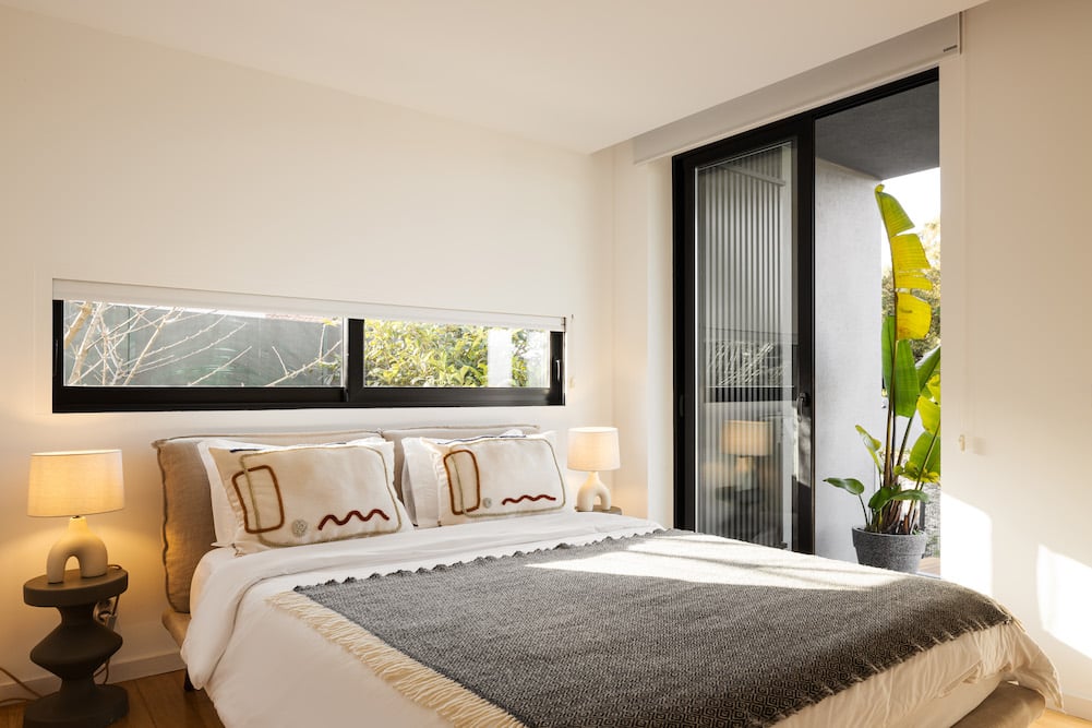 - The corridor leads to the three bedrooms and two separate bathrooms. The bedrooms have a double bed (160 x 200 cm or 140 x 200 cm), wardrobe and direct access to the garden.