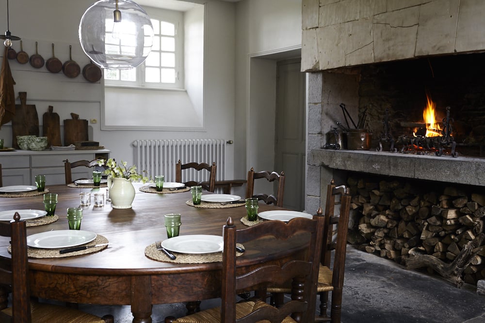 - A completely renovated antique kitchen with a large fireplace and a dining table.