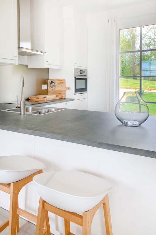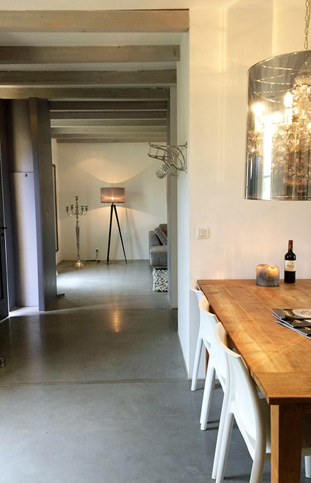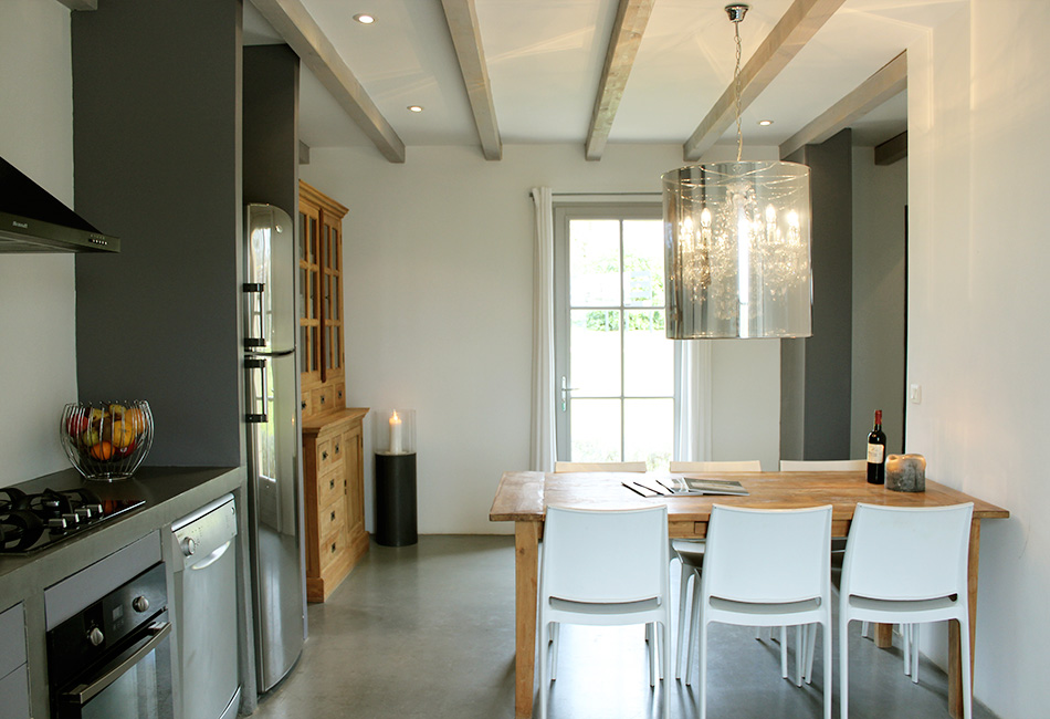The four holiday homes have 3 bedrooms, 3 bathrooms, a well-appointed kitchen, and a stylish living room. The subdued décor with polished concrete floors, white walls, and grey wooden beams is combined with colorful paintings and modern decorations. The door in the kitchen opens directly onto a private terrace with modern chairs, table, and parasols. From the private garden, a staircase leads to the shared pool (20x8m). Villa Sept has a private pool.