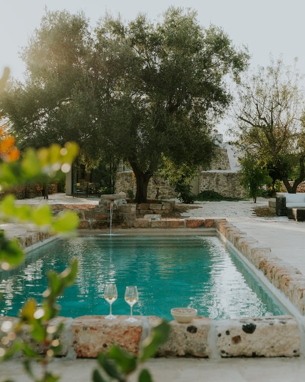 Corni di Fiasco is an authentic trullo (90 m²) with a modern extension, suitable for 4+1 persons. The villa features a living room with a fireplace, a fully equipped kitchen with glass doors opening onto the outdoor terrace, two double bedrooms (one located inside the trullo), a bathroom, and a patio with a lounge area. The 2-hectare estate offers several seating and dining areas, a rooftop terrace with sea views, and a pool set among olive and almond trees.