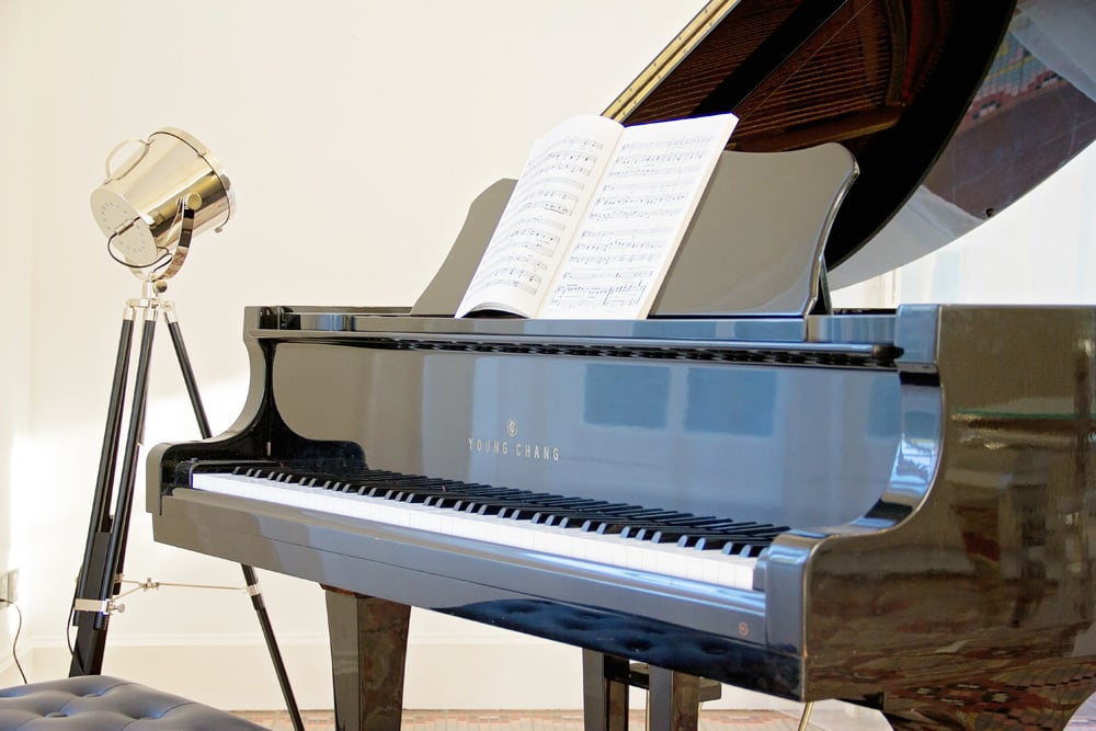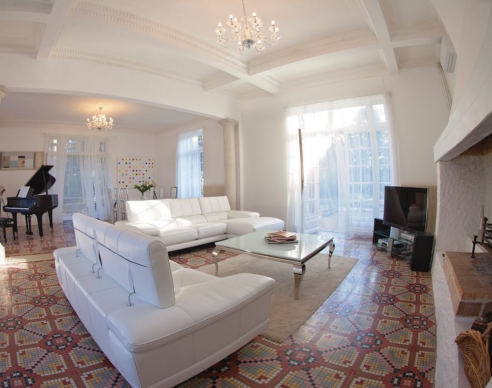 - Salon (60m2) with fireplace and grand piano