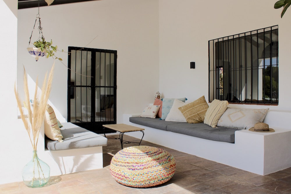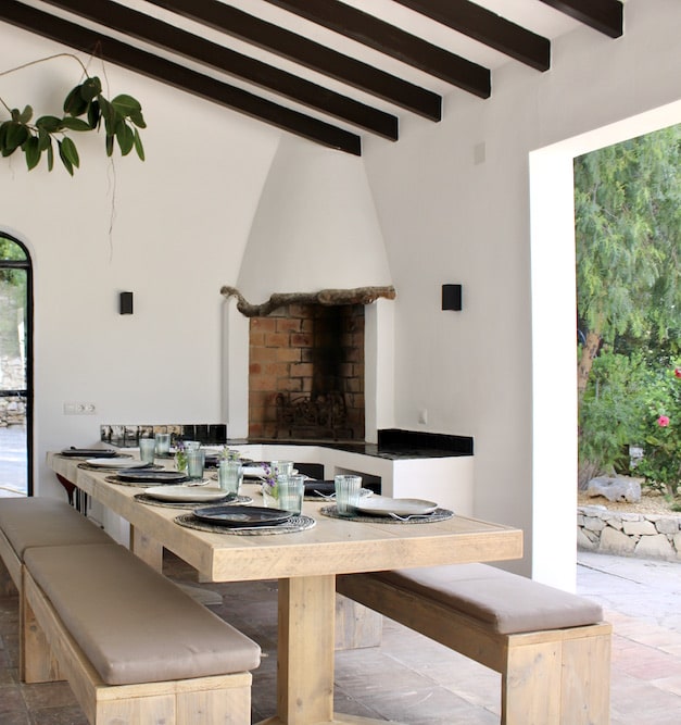 - in front of the villa you can chill on the spacious covered terrace in the lounge sofas, dine at the long dining table by the fireplace