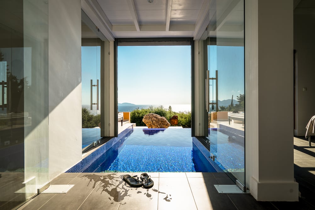 This suite is an intimate retreat for two and has a very special feature: a swimming pool that runs from the living room to the outdoors. Large windows provide plenty of natural light and allow you to enjoy the breathtaking views of the valley and the sea from anywhere in the house. On the left you will find the open living room with a dining table and the kitchen (which includes a Nespresso machine, kettle, oven, microwave, fridge, freezer, dishwasher, blender, toaster, induction hob and other cooking utensils). On the right you will find the Cocomat double bed and behind it the bathroom, equipped with toilet, washbasin and walk-in shower with a view. Outside there are several lounge areas, including a covered seating area with the dining table and gas barbecue. There are also comfortable sunbeds next to the special infinity pool (10 x 2 metres).