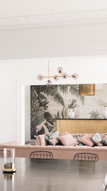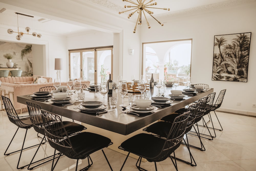 - The open living/dining room has two large sofas, a spacious dining table for 18 people, patio doors to the terrace, and a private cocktail bar with a few bar stools.