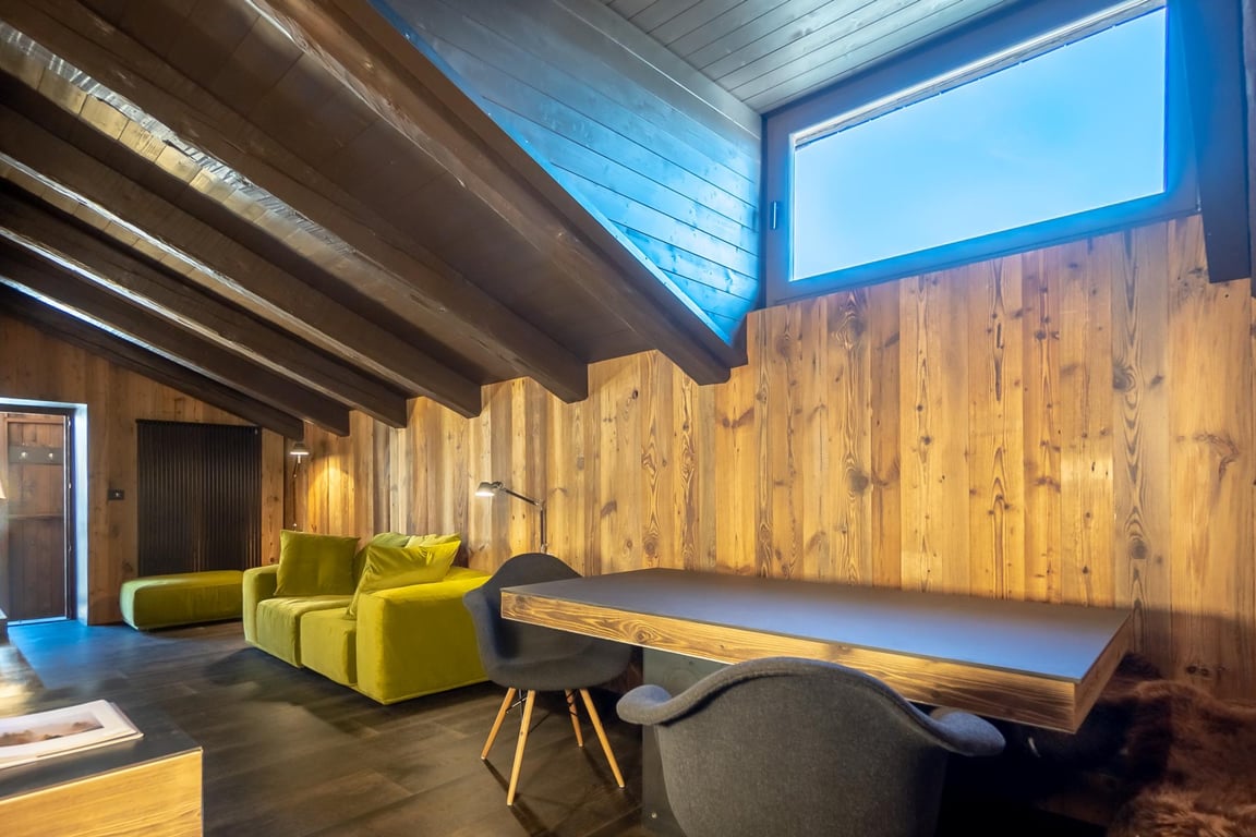 The Anima Monti apartment is on the second floor and represents the heart of the house. A dark slate floor, wood-clad ceilings and walls, and a minimalist design characterize the interior. You enter the apartment in the spacious open living room which is equipped with a modern sofa, fireplace, wooden sofa, and dining table with chairs. In this room, there is also a kitchenette with a ceramic hob, dishwasher, fridge, toaster, and kettle. There are two bedrooms both with a double bed. The modern bathroom is equipped with a toilet, sink, and shower. The apartment has 2 terraces with beautiful mountain views.