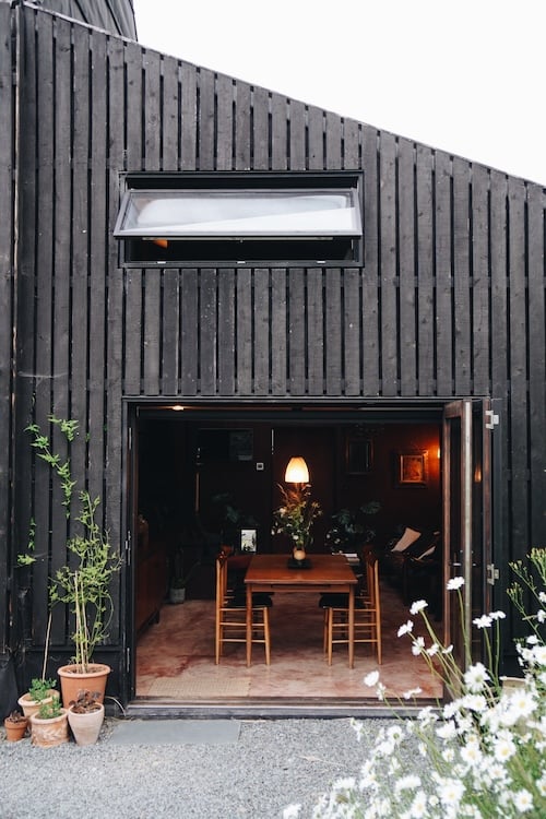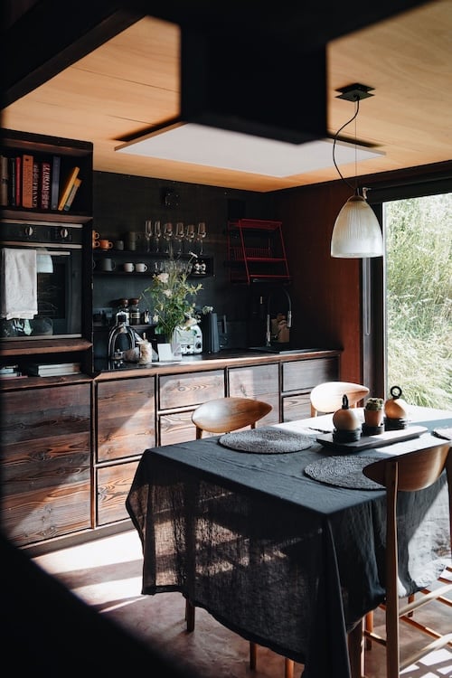 Inside, a mid-century-inspired interior awaits, with classics by Ib Kofod Larssen and Arne Jacobsen, complemented by local artworks and antique finds. Dark, rich tones contrast with light woods and soft microcement floors, while local timber and ecological materials pay tribute to the surrounding landscape.