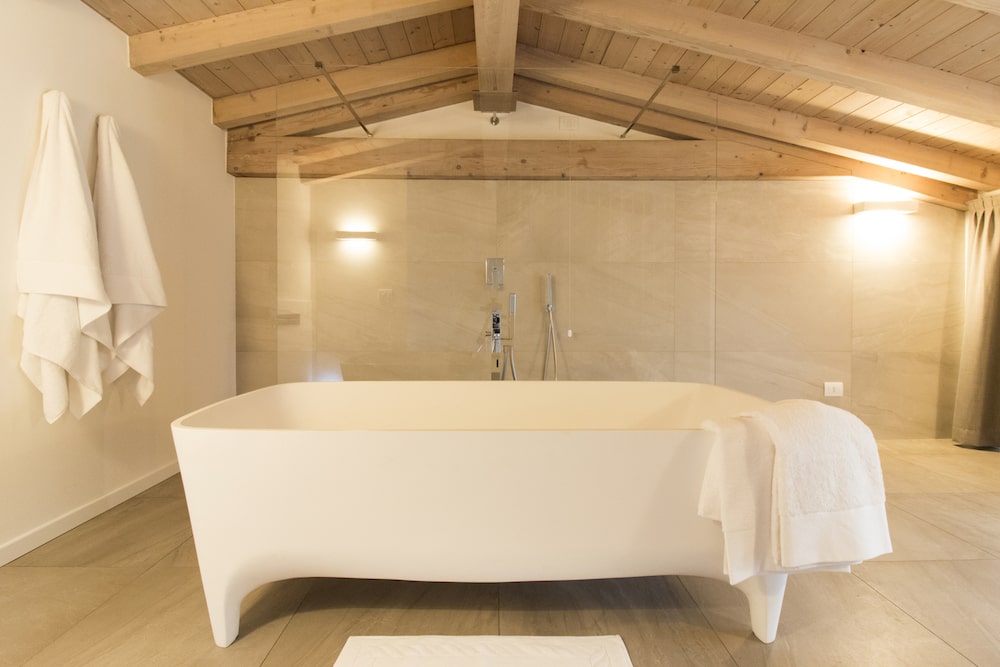 - On the lower floor is a double bedroom with its own toilet and an open bathroom on an attached upper floor with a modern free-standing bath in the middle and a very spacious walk-in shower.