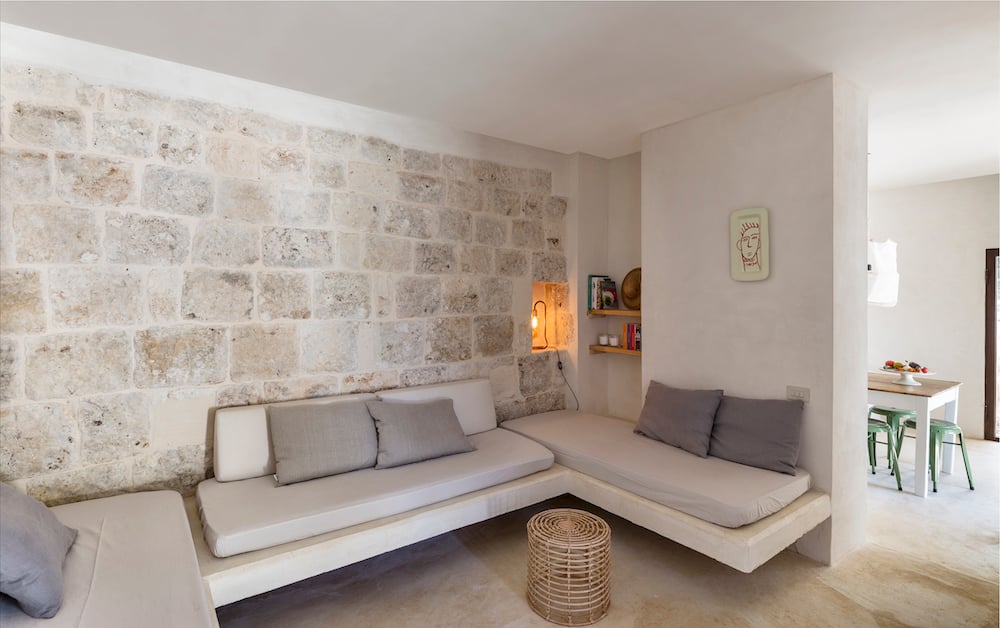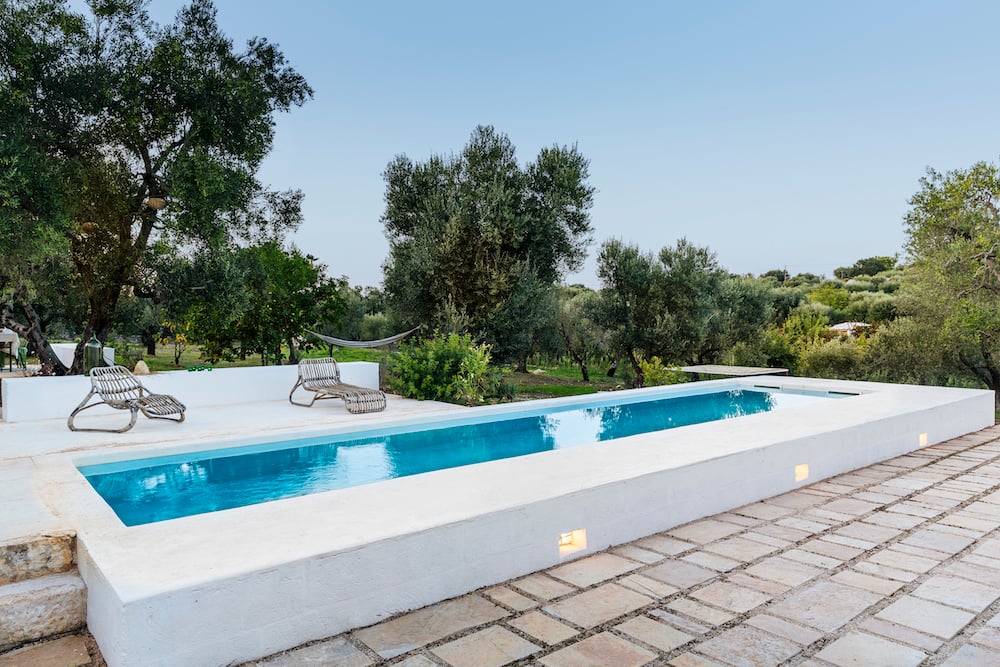 The one-story house is built in traditional Pugliese style; it has white walls, playful alcoves, and it is decorated in soothing colors. The kitchen and the living area give access to the terrace with private pool.