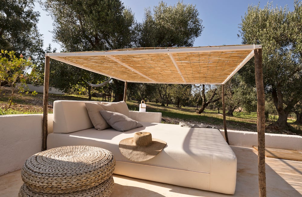 - There are three spacious terraces: one includes an outdoor kitchen with a grill and a large dining table. The second terrace also features a dining table and is the perfect place to have lunch under the shade of the ancient olive tree or to enjoy an al fresco dinner. The third terrace is equipped with a stylish double lounge bed covered by a wooden pergola.