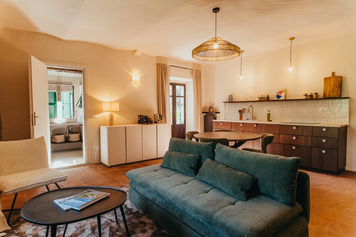 The two apartments for 2–6 people and one apartment for 2 people combine authentic features with contemporary comfort. Terracotta floors, vaulted ceilings, and natural stone details create an authentic ambiance, while fully equipped kitchens and comfortable bedrooms ensure a relaxed stay. Whether you choose the cozy studio La Noce or one of the more spacious first-floor apartments, each offers views of the garden, the pool, and the surrounding hills.