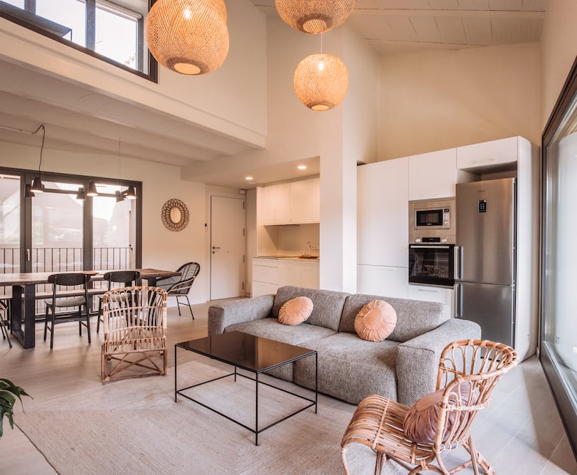 La Comuna Residence Girona consists of six apartments (for 4 people) and a penthouse (for 8 people), which are spread over the three floors of the residence. All apartments have a double bedroom and a sofa bed, a stylish open-plan living area with a fully equipped kitchen, and modern bathrooms. The penthouse has three bedrooms and bathrooms, an open living area with a sofa bed, a fully equipped kitchen, and sliding doors to a covered terrace.