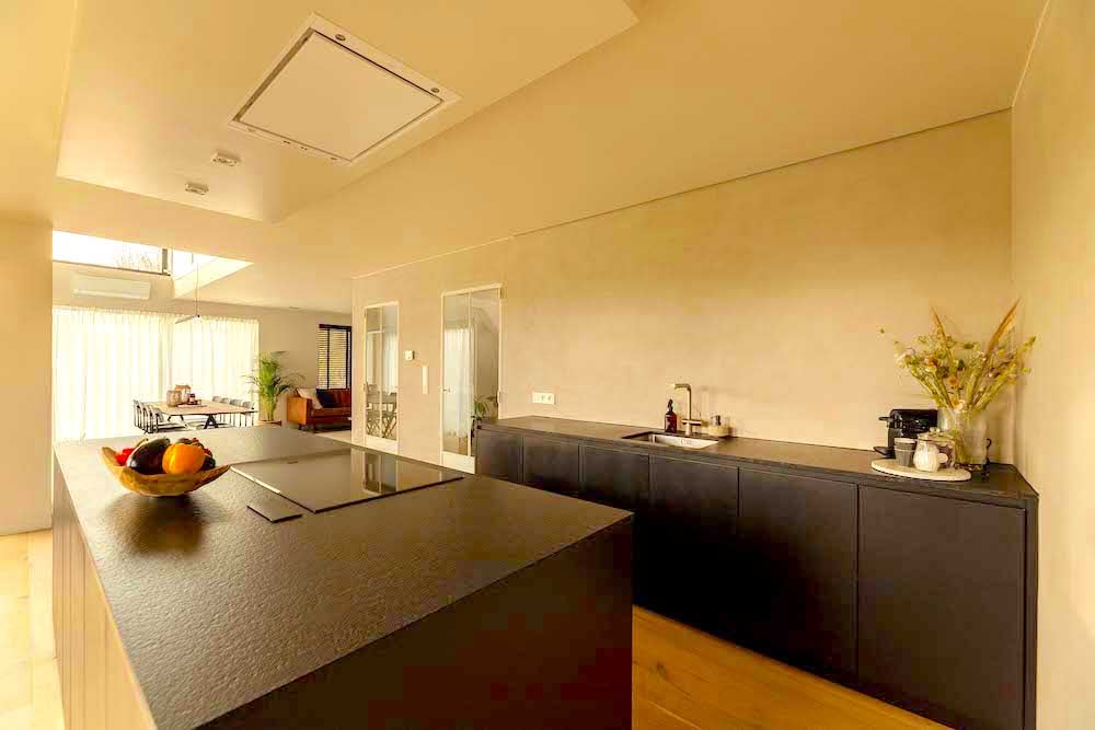 - Open plan living(air-conditioned) with a sleek kitchen with a large cooking island. The kitchen is equipped with an induction hob, espresso machine, air fryer, coffee maker, oven, dishwasher, and dishes (including plastic dishes for outside).
