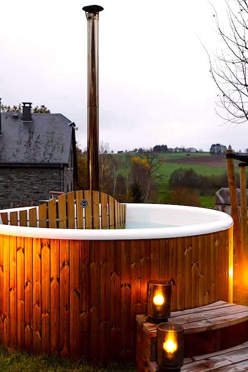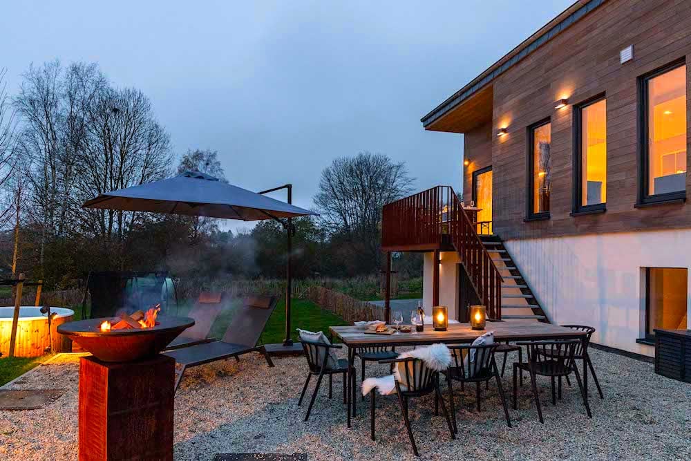 - A small terrace with a table and benches where a staircase leads down to the garden with a second terrace. Here is a large dining table for 10 people, an Ofyer barbecue, deck chairs, a hot tub, and a trampoline. The garden is completely fenced.