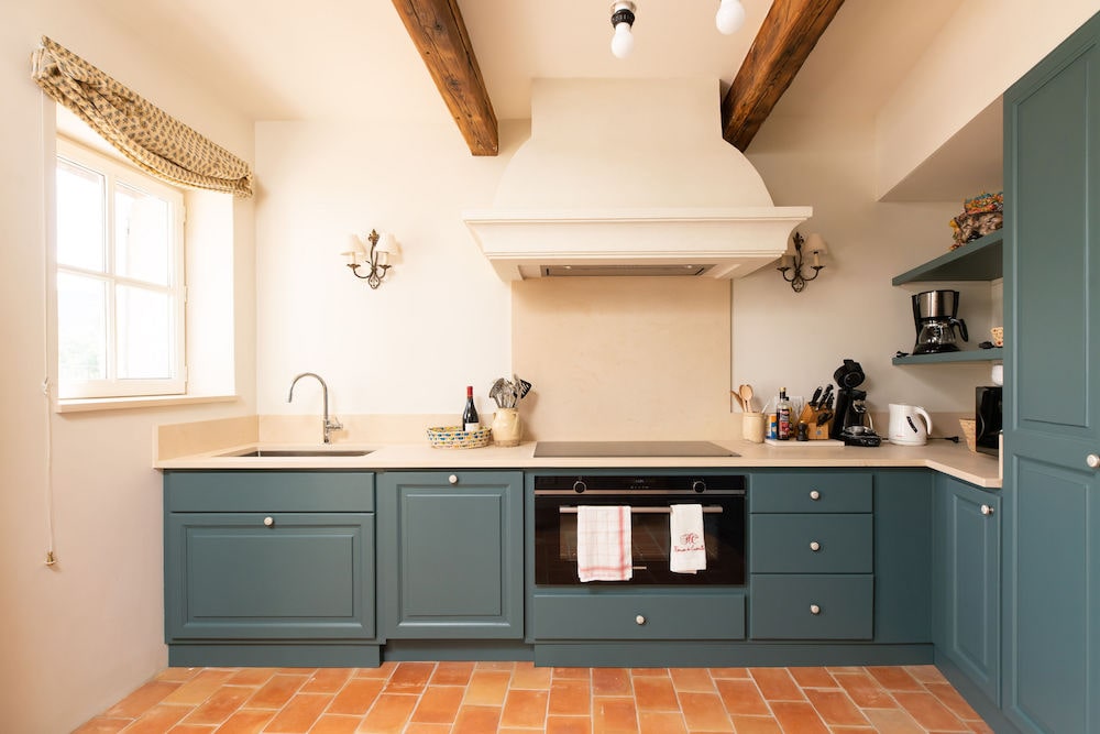 - Country kitchen with an oven, hob, extractor, fridge, dishwasher, espresso machine, coffee maker, kettle, and microwave.