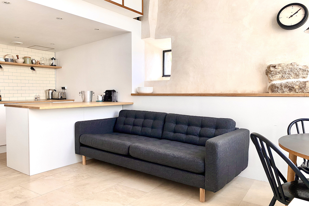 - The house has a large open living room with a polished concrete floor with underfloor heating (in winter months), various comfortable chairs and sofas, a large glass dining table, a cast iron wood stove (logs available), a guest toilet, and a TV