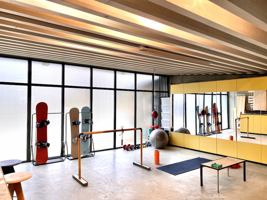 - Gym/ski boot room (51m2). This room is also equipped for drying and storing skis and snowboard equipment. The space also serves as a fitness room. It is equipped with basic equipment such as yoga mats, dumbbells, balance ball, kettlebells, and a ballet barre.