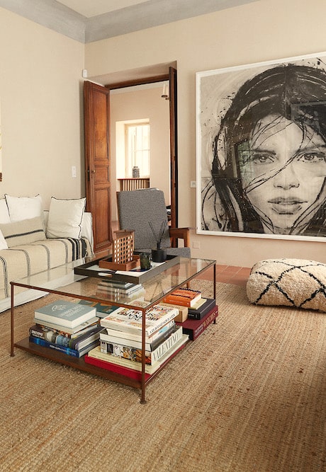 - Attractive connected living rooms furnished with comfortable sofas, armchairs, books, a fireplace and eye-catching paintings