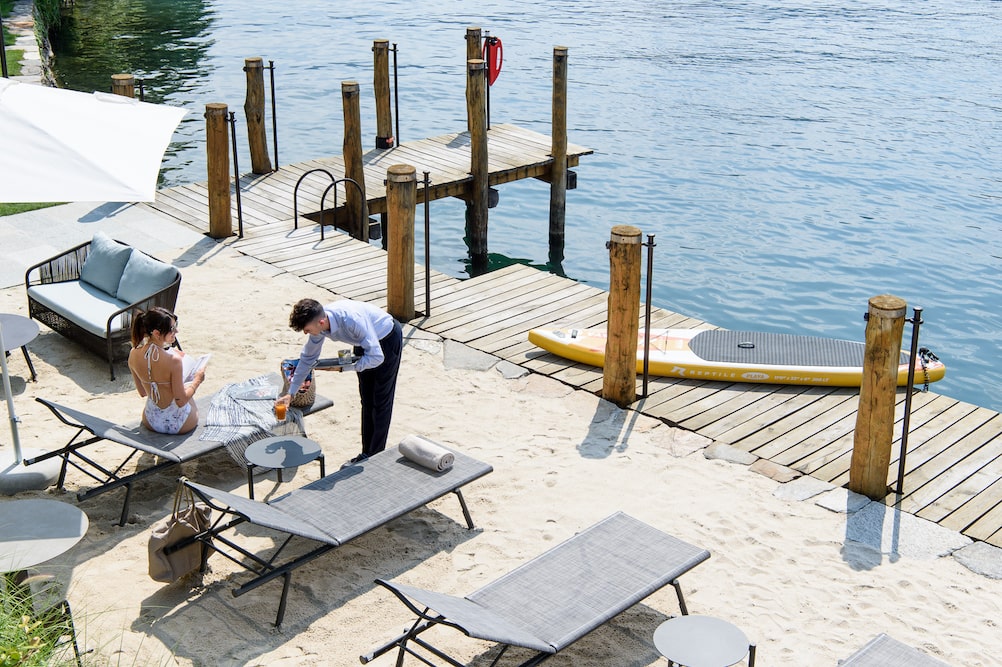 Laqua by the Lake is divided between the main structure with the 18 boutique apartments/suites, the bistro serving breakfast, lunch, an aperitif, and dinner, and the swimming pool with the beach club and a small private beach.