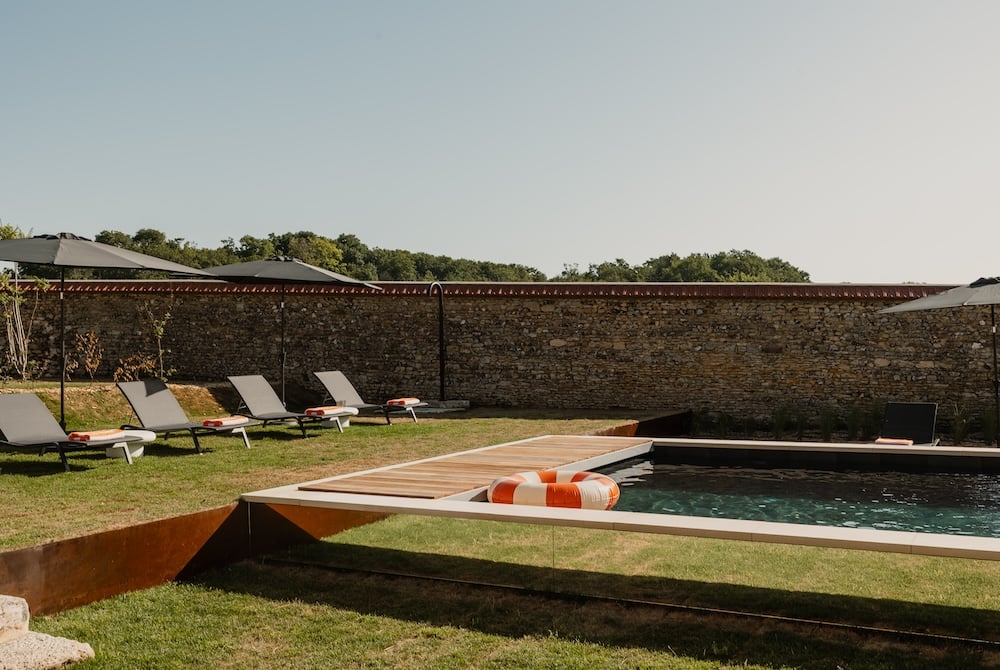 - The heated swimming pool (open April–October) forms the heart of outdoor life, surrounded by loungers and Mediterranean plants.