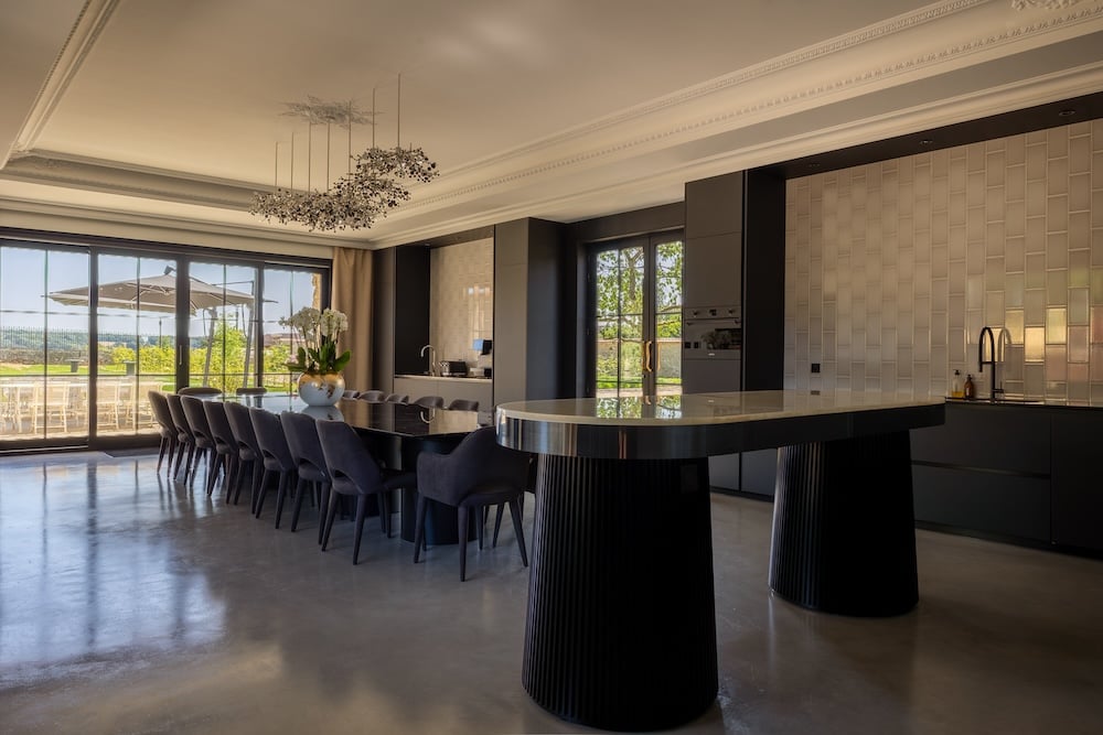 - On one side lies an elegant living room with a fireplace and a spacious dining area for up to twenty guests, opening onto the terrace and the kitchen. The kitchen is fully equipped for convivial dinners: large oven, two refrigerators, wine cooler, espresso machine, kettle, induction hob, Quooker tap, freezer, dishwasher, microwave, toaster, and blender.